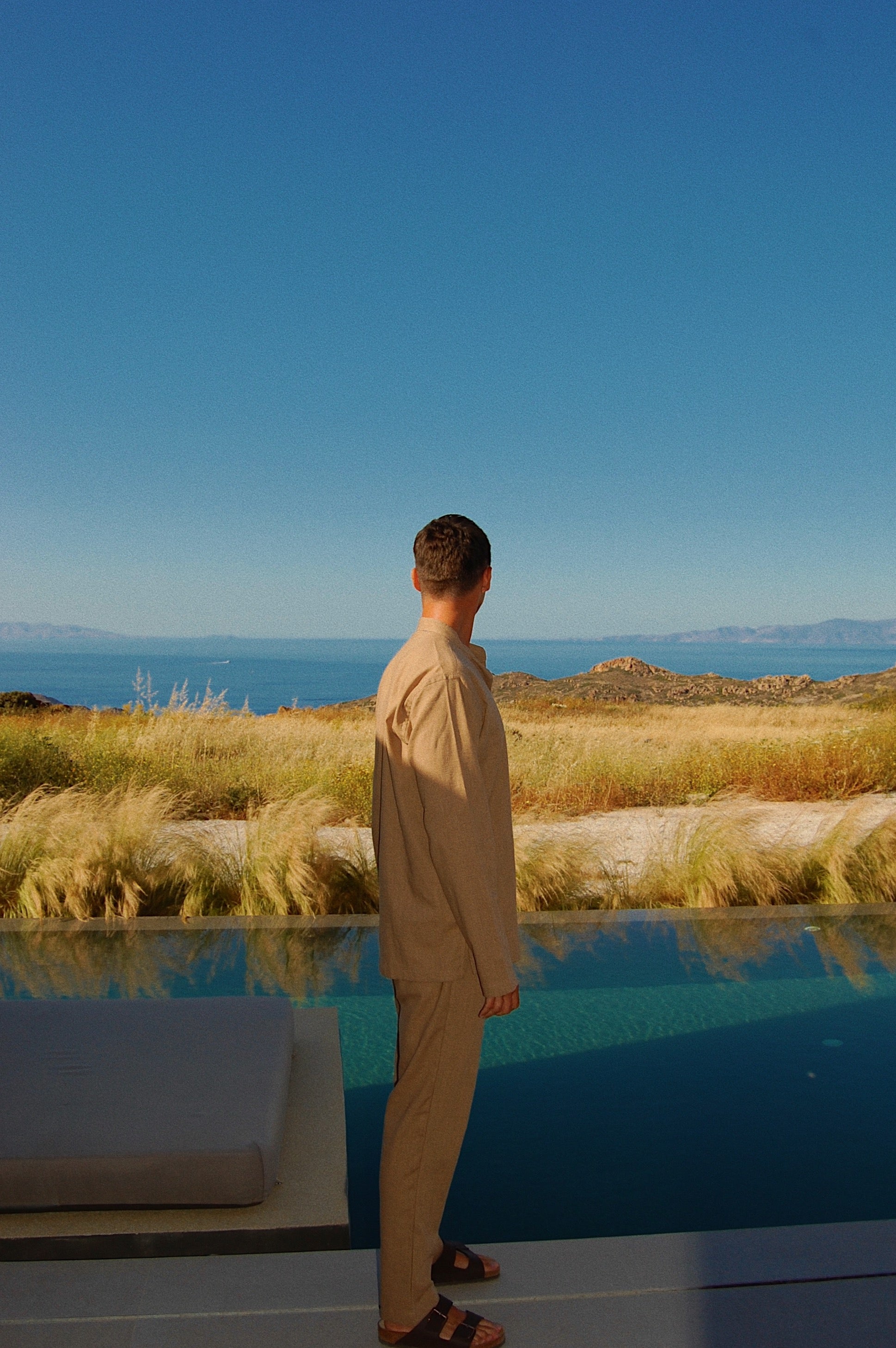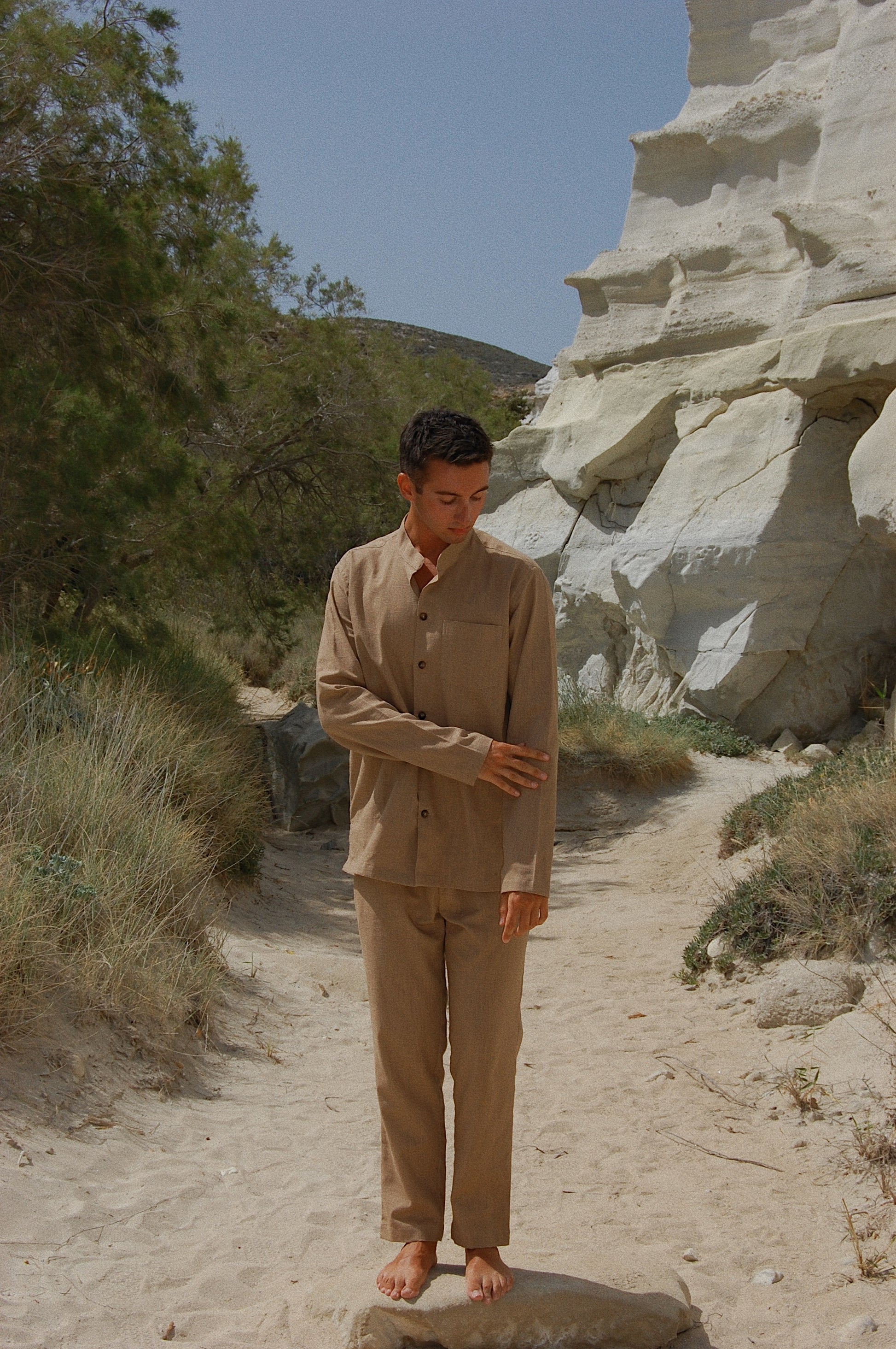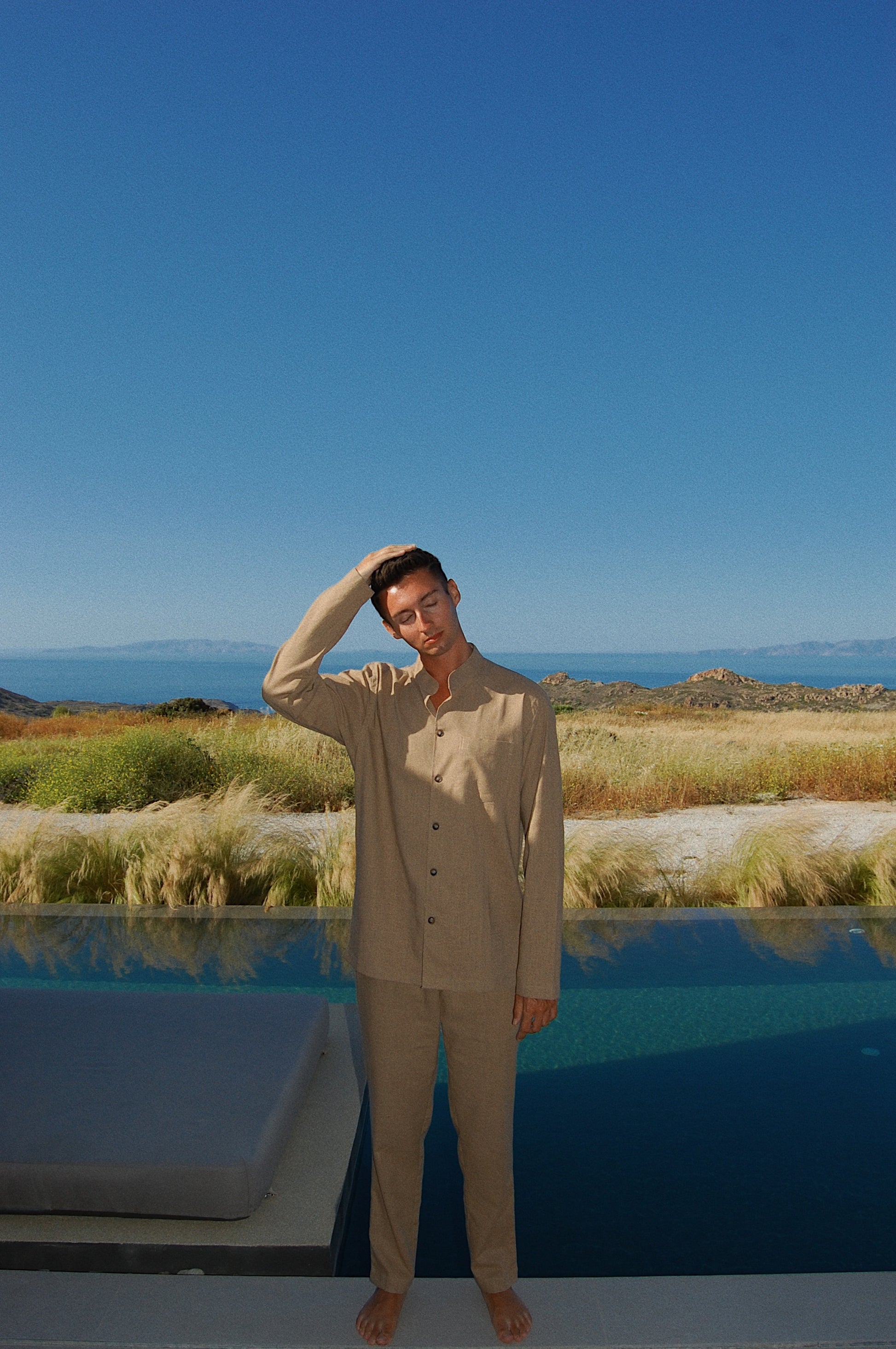 Designed to blur the lines between day and night. With its mandarin-collared shirt and easy-draping pants, CAFÉ MARÉ set carries the kind of elegance that feels effortless but deliberate. Made for the hours that stretch on, where the café turns into dinner and the evening still belongs to you.