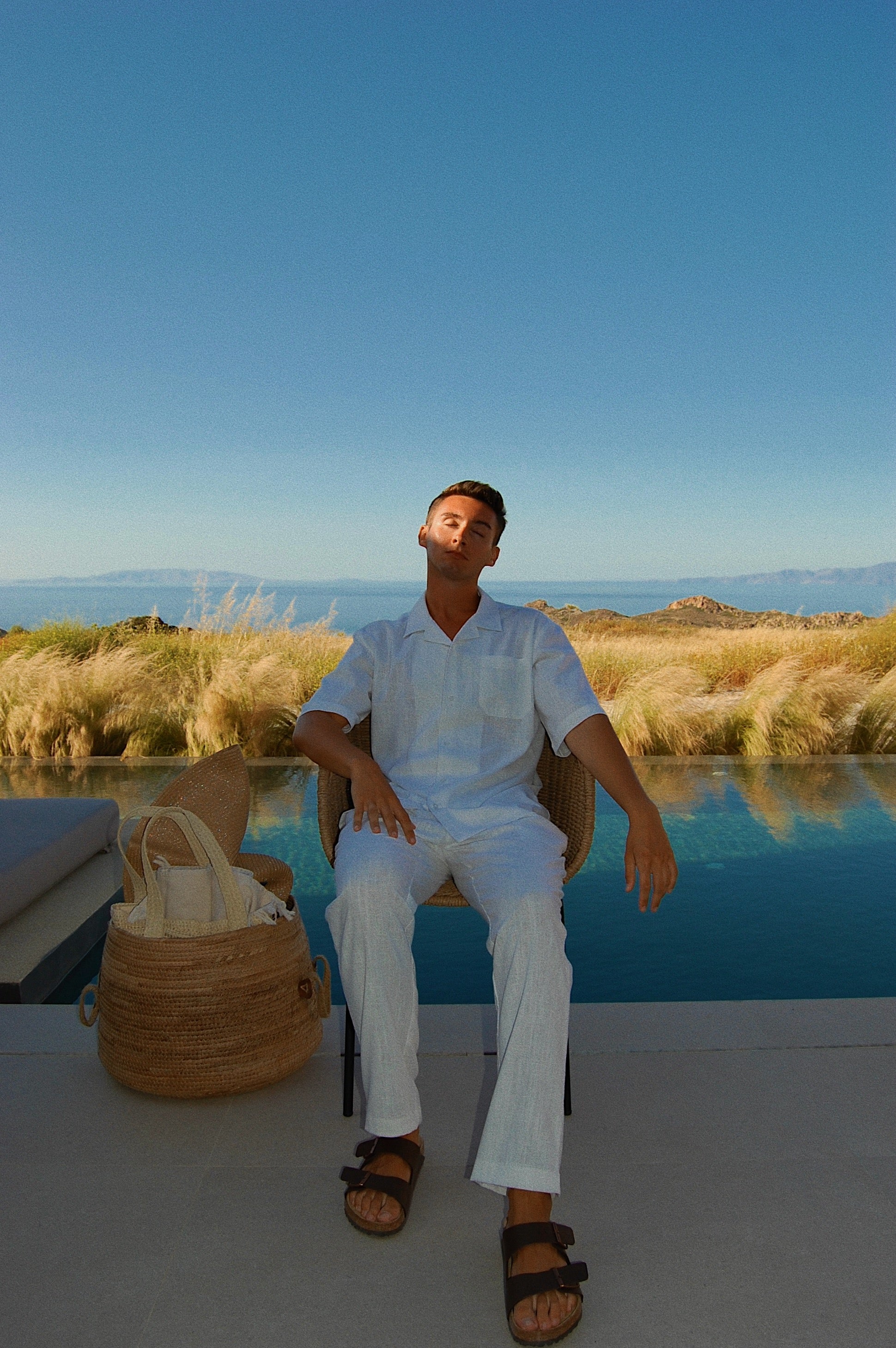 SEAWASH is a short sleeve shirt in crisp white, woven from a linen-cotton blend that feels like the air just before sunset. The relaxed collar drapes open, tracing the shape of your frame, made for long walks along the sand or slipping into a seaside dinner without changing a thing. It carries the rhythm of the coast with you. It's soft, fluid and always ready for wherever the evening goes.