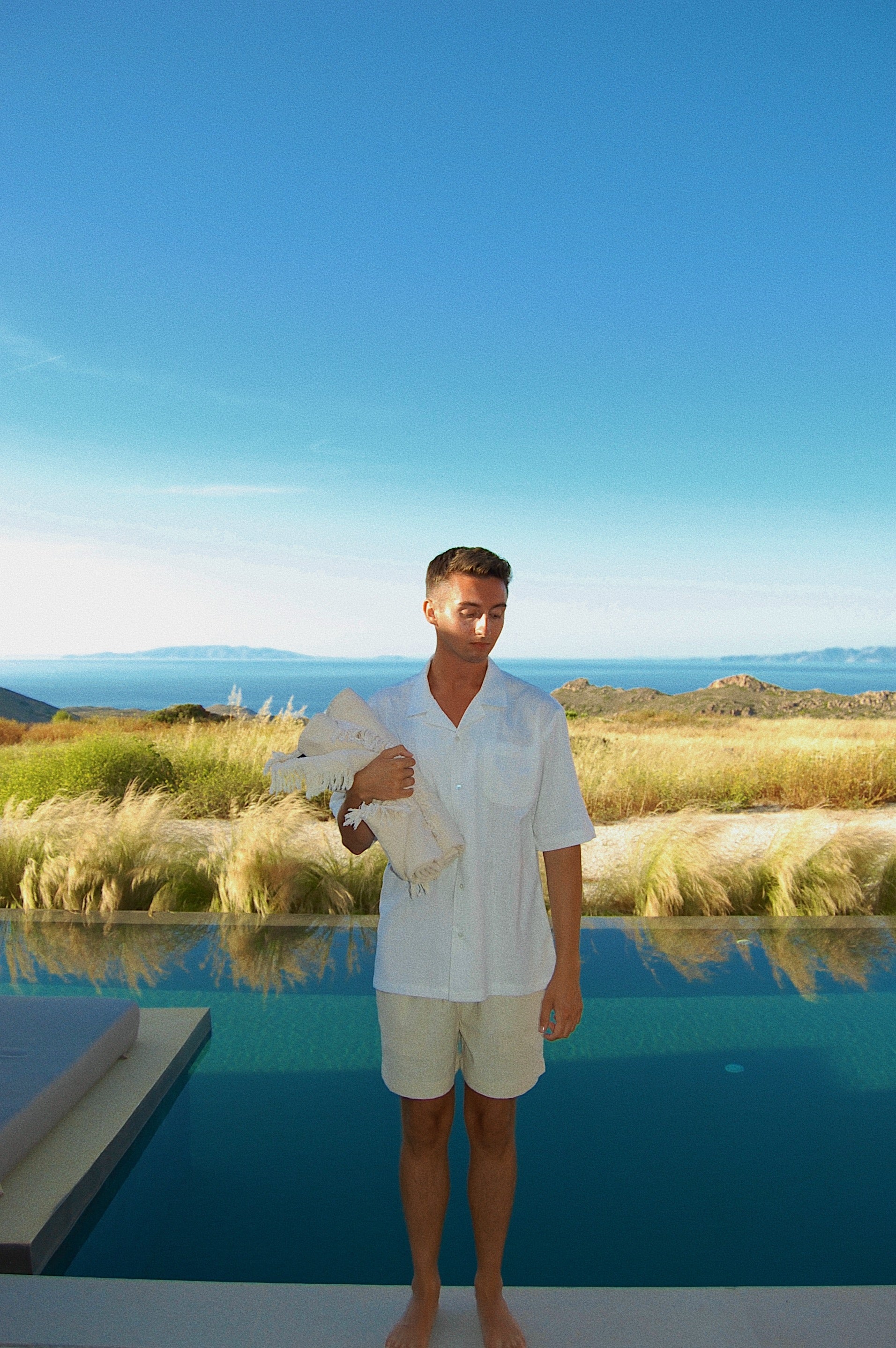 A crisp white short-sleeve shirt paired with oatmeal beige shorts, the DAYSHIFT set is made from a light linen-cotton blend that lets the air in and the day unfold. It’s made for mornings that begin without a plan, when coffee lingers and the shoreline calls. Whether you're easing into the day or walking where the waves meet the sand, this set moves with the same calm rhythm.