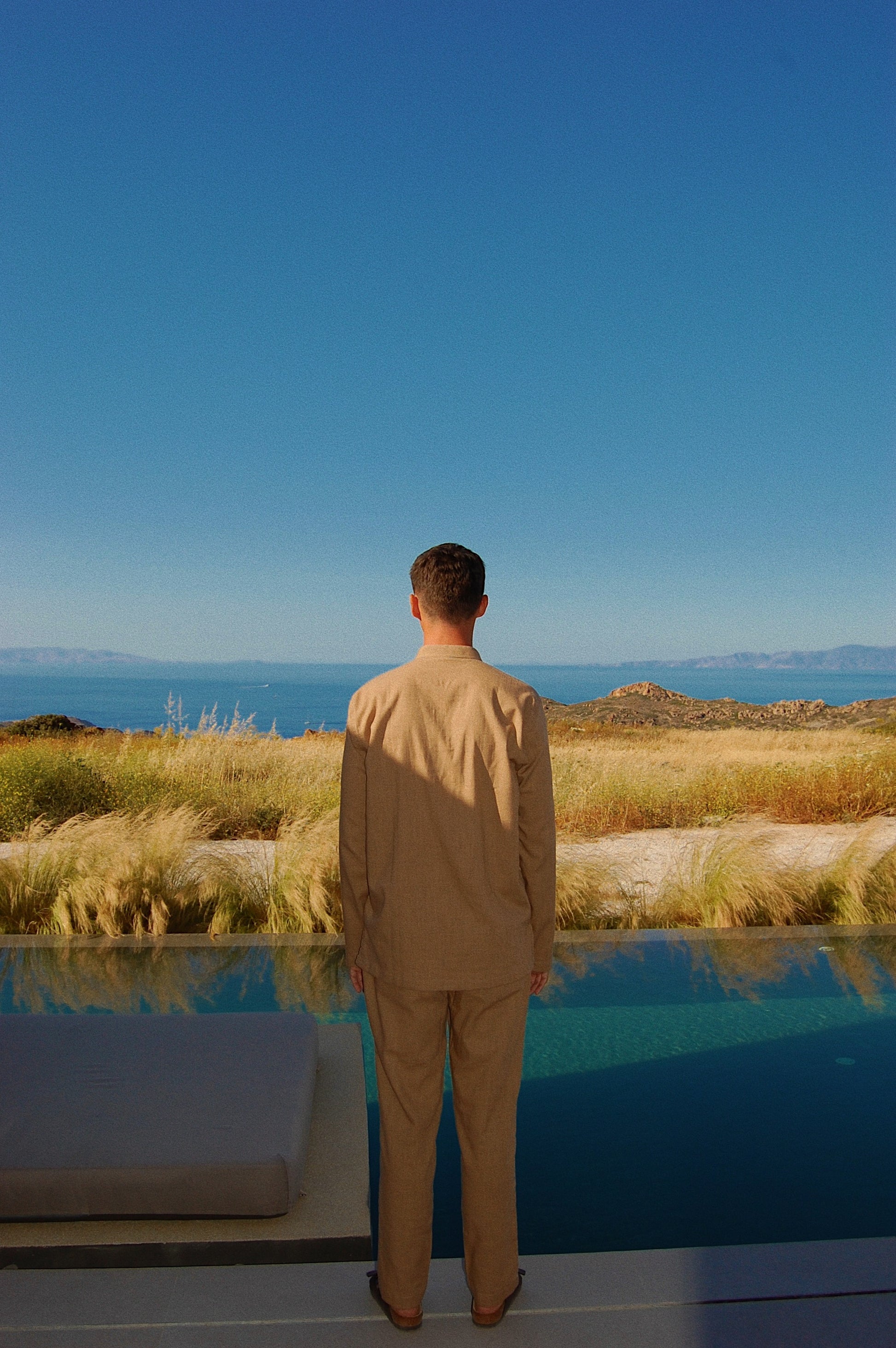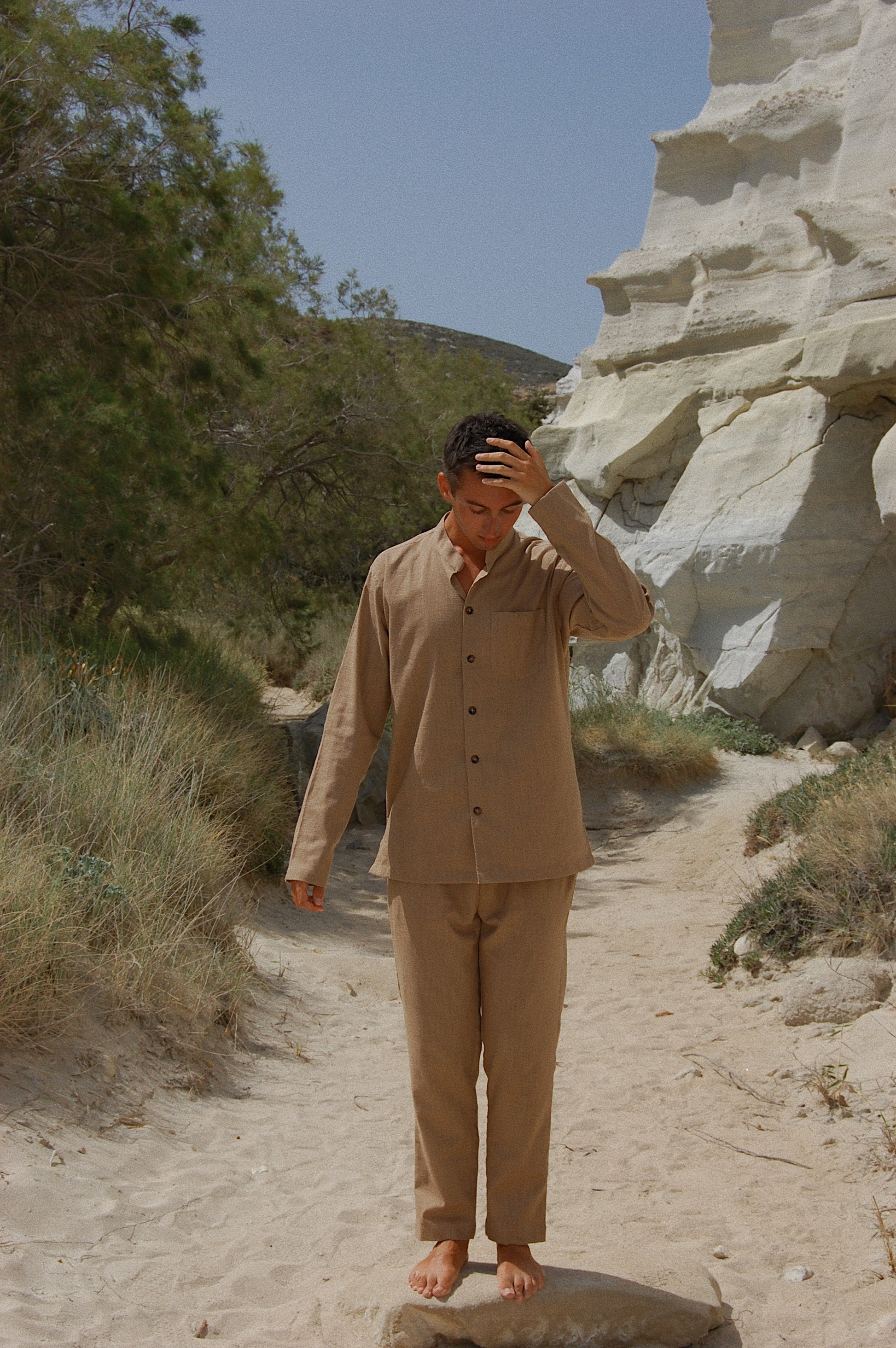 SECOND SUN is a long sleeve mandarin-collared shirt in tan beige, crafted from a linen-cotton blend that feels light against sun-kissed skin. It’s made for the blur between sea and city when you find yourself at dinner with friends, laughter spilling out into the warm air. The collar sits close, refined but relaxed, like a quiet nod to the elegance of living slowly.