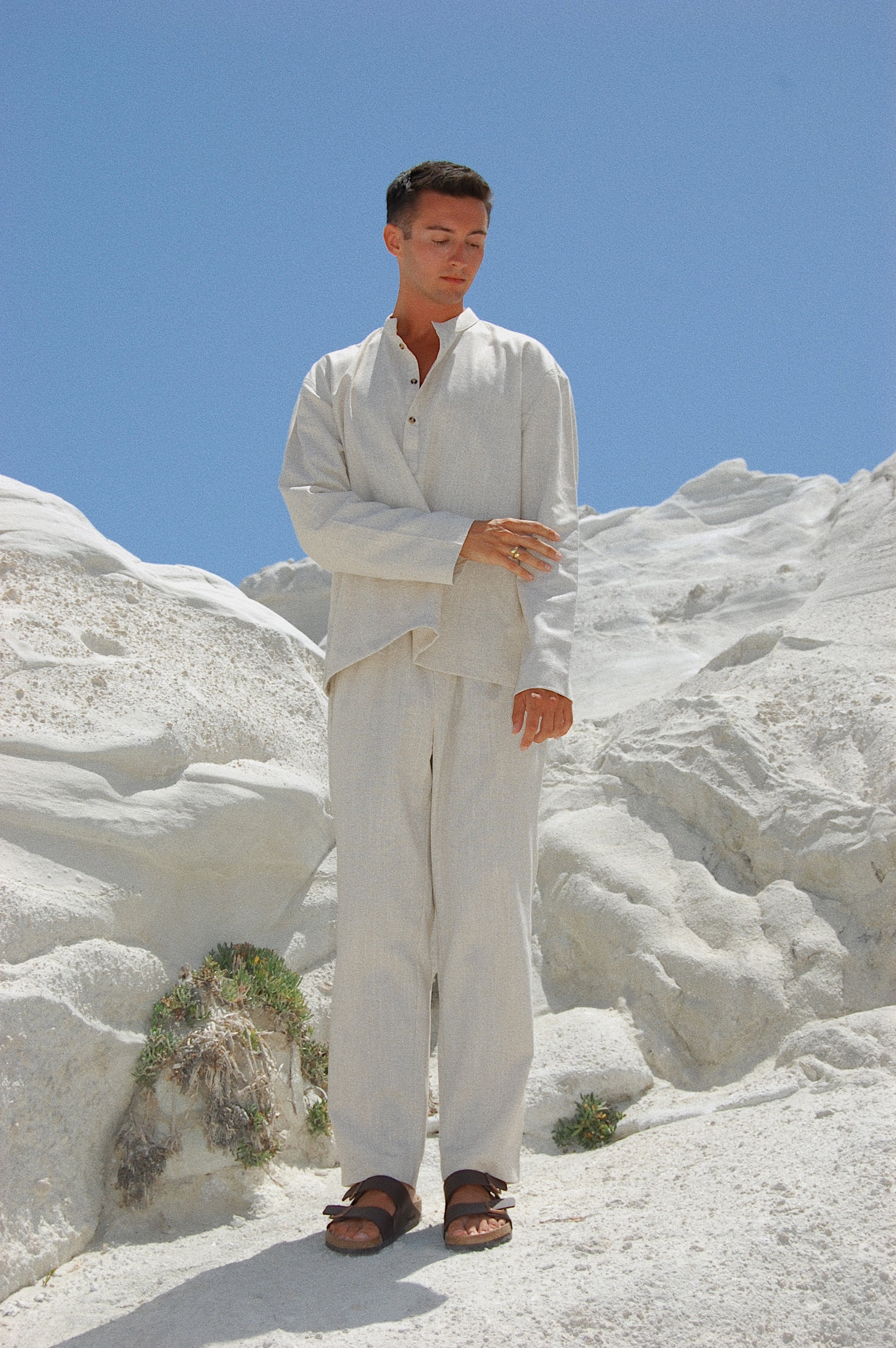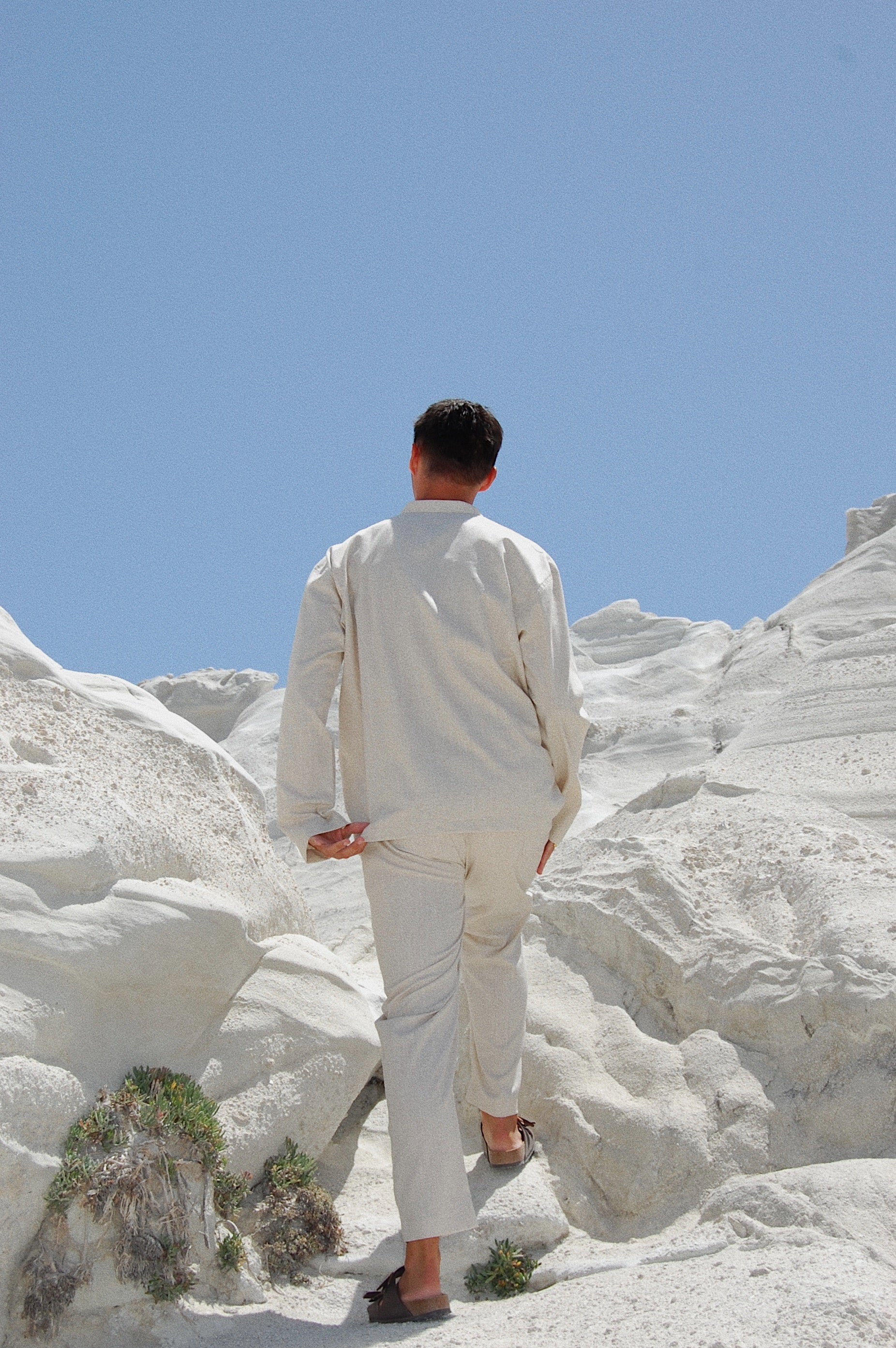 The CAFÉ MILOS set captures the ease of island living. It is made of linen that breathes with you, silhouettes that catch the breeze. It’s what you reach for after a swim in crystalline waters, when the day drifts lazily into rosé and laughter by the sea. Thoughtfully tailored, yet undone in all the right ways. A wardrobe postcard from the Aegean.
